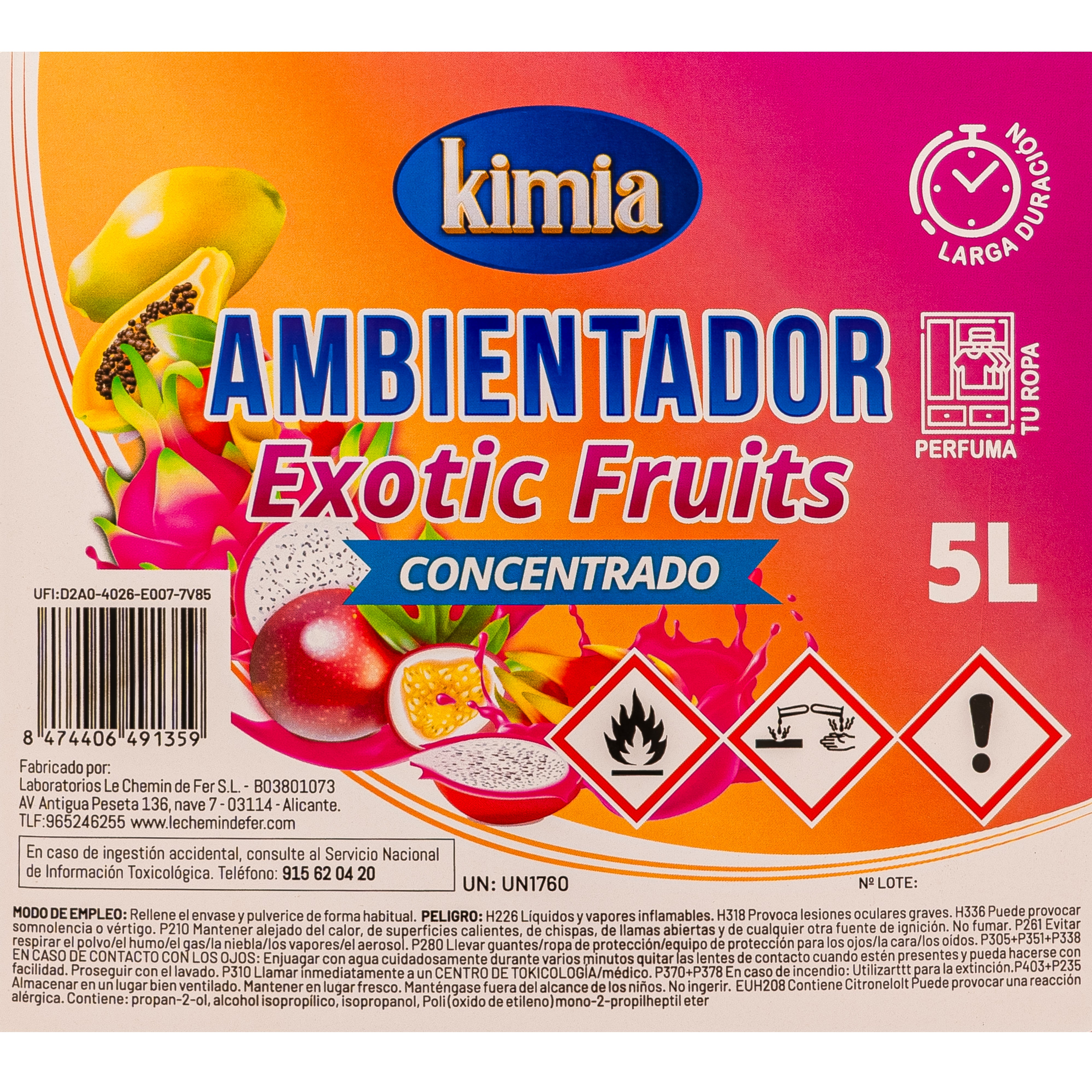 *Ambientador líquido concentrado profesional. Fragancia Exotic Fruits. Formato de 5 litros. Larga persistencia. Evitar pulverizar directamente sobre superficies calientes o llamas.