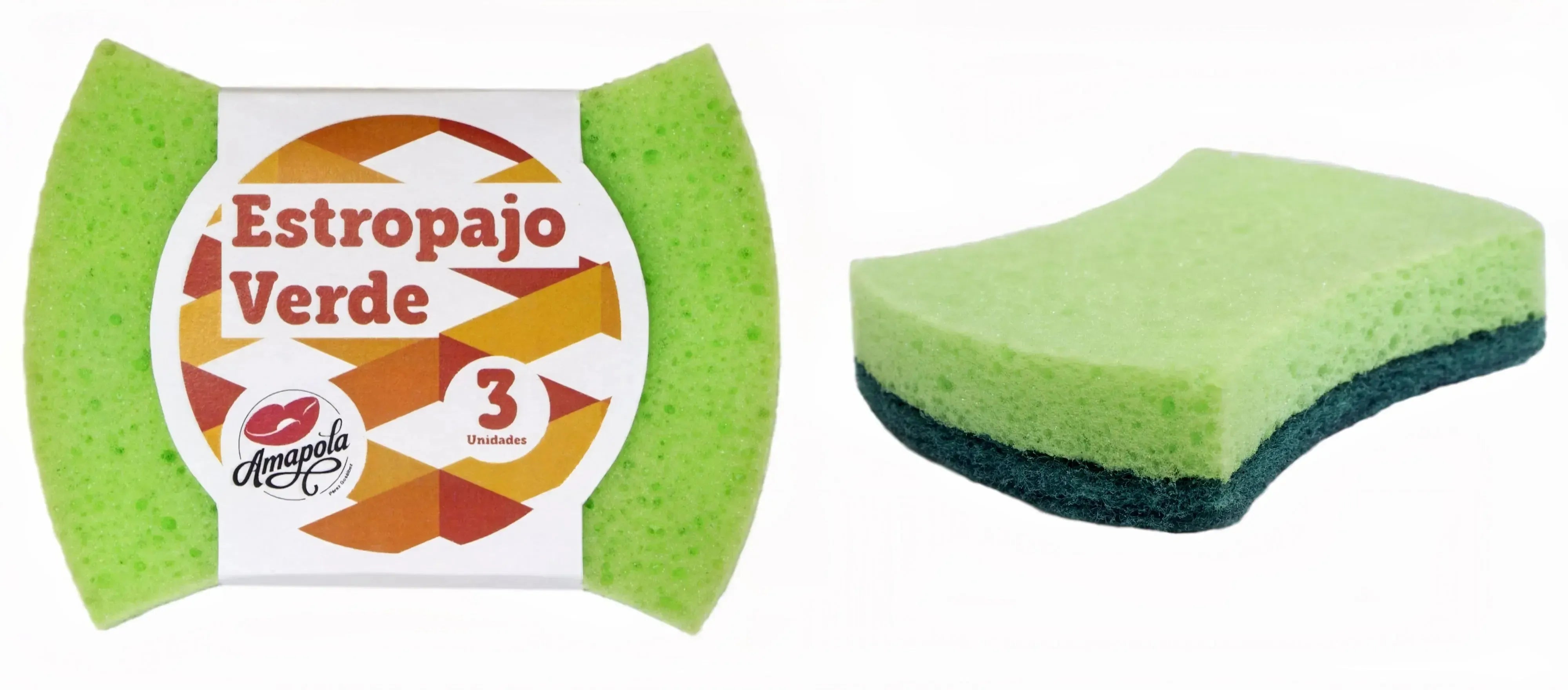 Estropajo Fibra Verde Con Esponja 10,5X8X2,5 cm., Lote 3 Unidades
