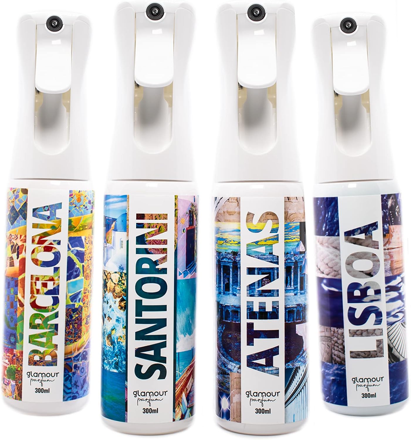 GLAMOUR PARFUM - Pack 4 Ambientadores de Hogar - Fragancia Barcelona, Santorini, Atenas y Lisboa - 4 x 300 ml - Pack Holidays Dreams - Ambientadores Textiles en Spray - Reutilizable
