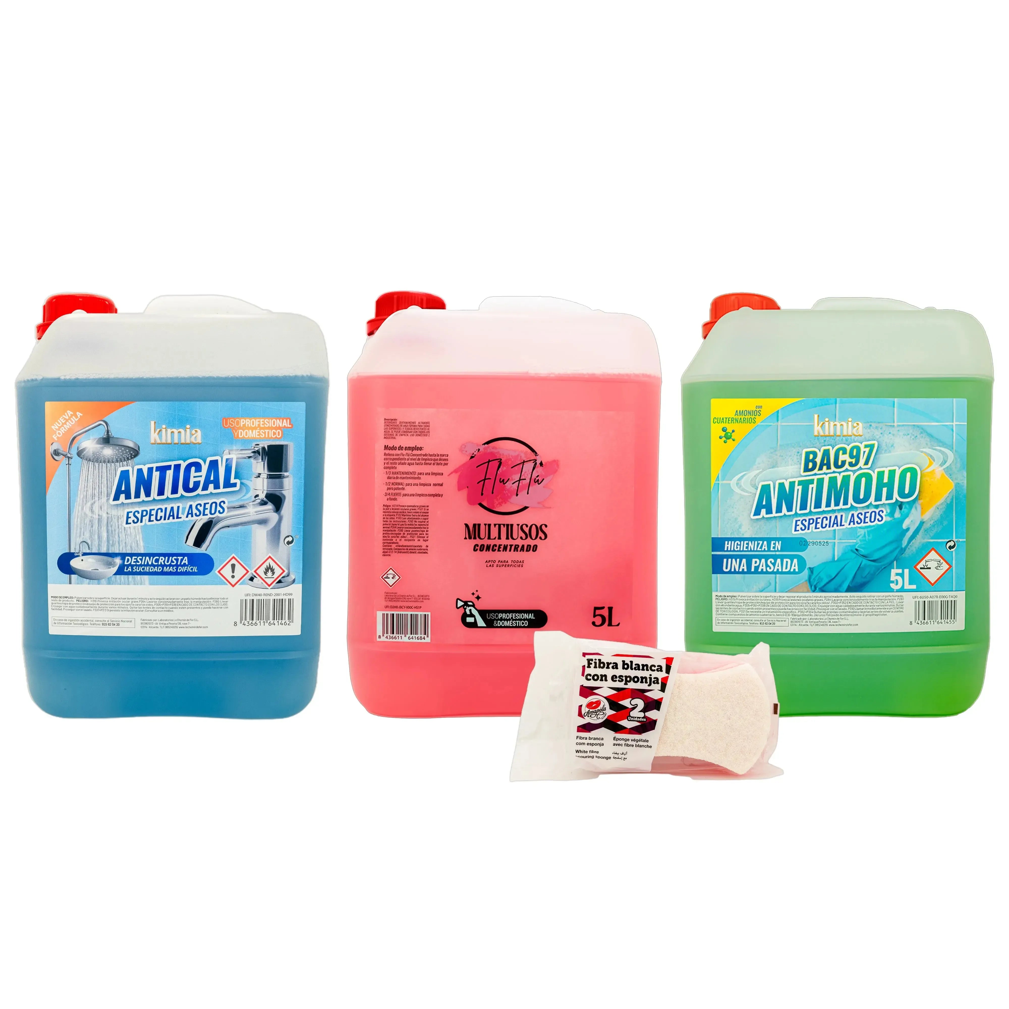 Limpieza profunda y desincrustante para baños y zonas con cal. Este pack reúne 3 soluciones concentradas KIMIA para atacar sarro, óxidos y restos de jabón, y dejar un acabado fresco en superficies. Incluye además un estropajo profesional para facilitar el trabajo.