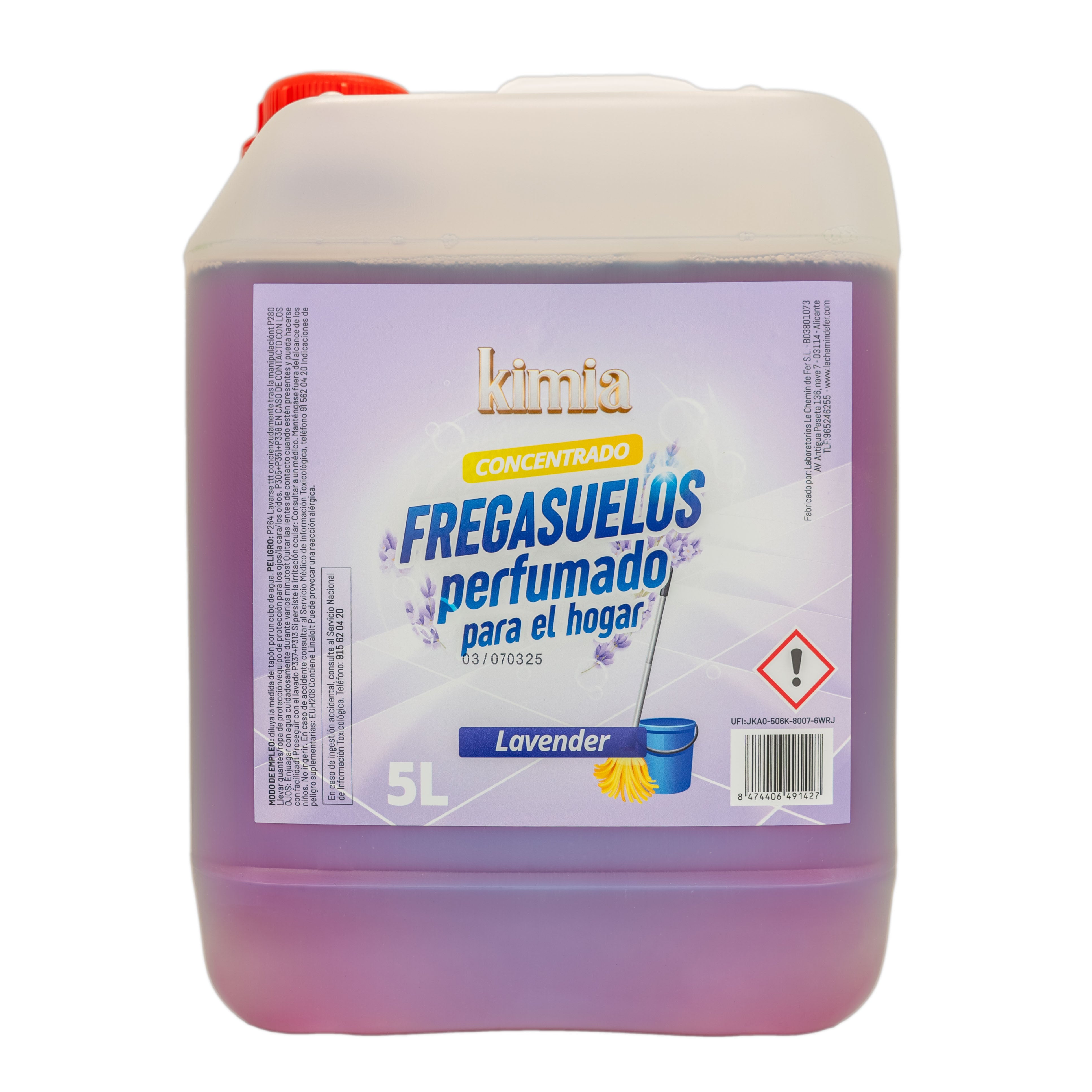 • Fregasuelos Lavanda: diluir 30–50 ml en 5 L de agua según suciedad. Fregar como de costumbre; no requiere aclarado en suelos lavables.