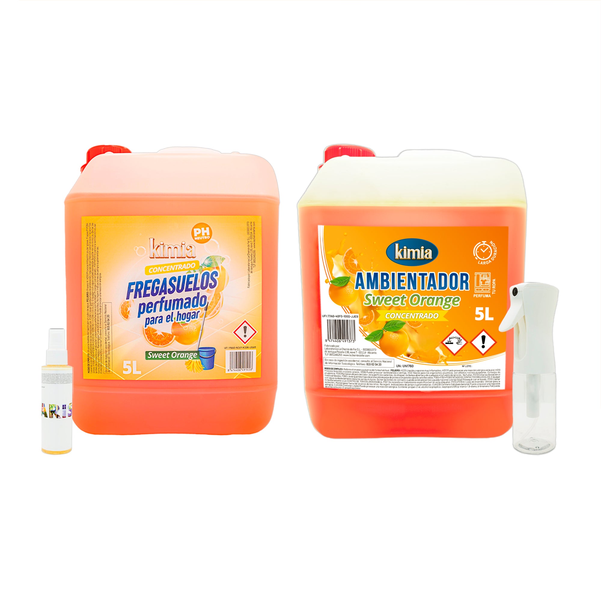 Energía cítrica y limpieza profunda en gran formato. Este pack combina un Ambientador concentrado Sweet Orange 5 L y un Fregasuelos perfumado Sweet Orange 5 L, junto a una botella atomizadora reutilizable y un Petite de regalo, para llenar tu hogar de frescura a naranja mientras limpias a fondo.